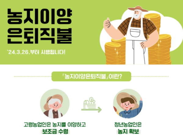 ‘농지이양은퇴직불사업’은 농업을 은퇴한 고령 농업인의 생활 안정을 돕기 위해 농업인이 소유한 농지를 공사에 매도 또는 매도를 조건으로 임대하는 경우 매월 일정 금액의 직불금을 지원하는 제도로, 올해 126억 원의 예산이 편성되었다.