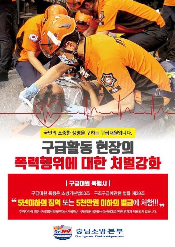 [충청뉴스 권상재 기자] 충남도 소방본부는 최근 발생한 소방대원 폭행사건과 관련 무관용 원칙에 따라 강력 대응한다고 16일 밝혔다.