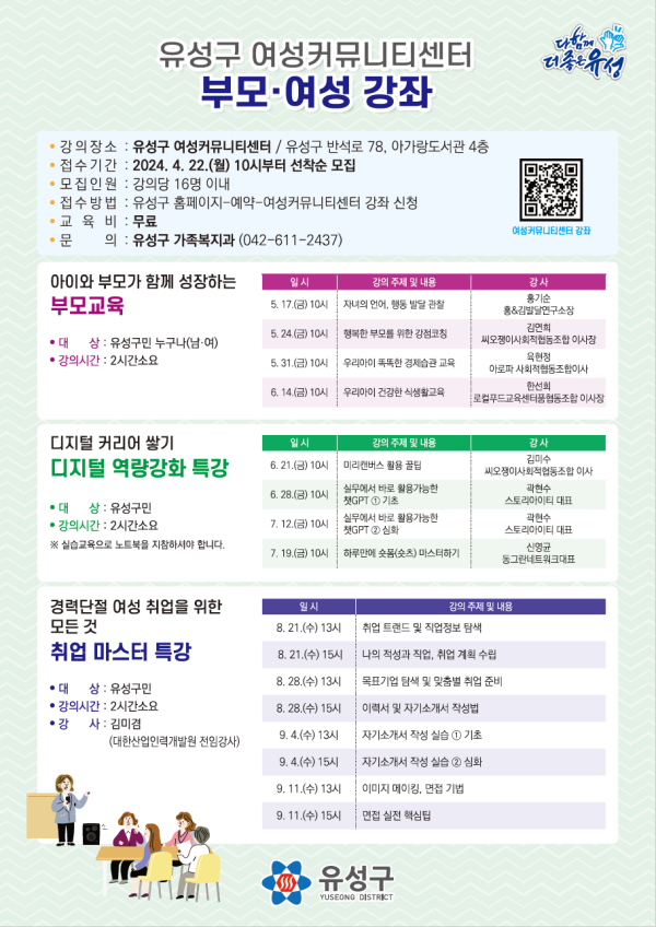 참여 신청은 4월 22일부터 유성구 홈페이지 여성커뮤니티센터 강좌 신청에서 할 수 있고, 각 강좌별 16명을 선착순 모집하며, 자세한 내용은 유성구 가족복지과로 문의하면 된다.