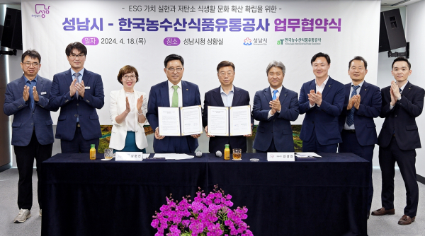 [충청뉴스 최형순 기자] 한국농수산식품유통공사(사장 김춘진)와 성남시(시장 신상진)는 18일 성남시청에서 ESG 가치 실천과 저탄소 식생활 확산을 위한 업무협약을 체결했다.