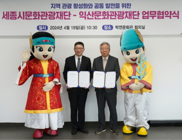 주요 협약내용으로는 △세종·익산 연계 금강 문화권 관광상품 및 프로그램 개발 협력 △백제문화 관광콘텐츠를 활용한 공동 마케팅 협력 지원 △양 기관 문화·예술·관광·축제 활성화를 위한 정보 및 인력 교류 △국내외 관광객 유치 및 관광 진흥을 위한 공동 협력 등이다.