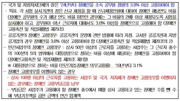 아울러 장애인고용에 앞장서야 할 공공기관부터 ‘장애인고용촉진 및 직업재활법’ 규정을 준수하여 사회적 책무를 다할 수 있도록 촉구할 계획이다.