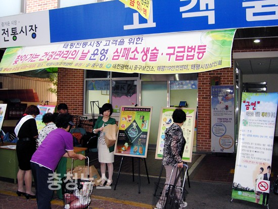 대전광역시 중구(구청장 박용갑)는 17일 태평시장 고객지원센터에서 전통시장 상인 및 고객을 대상으로 `찾아가는 건강관리의 날'을 운영했다.