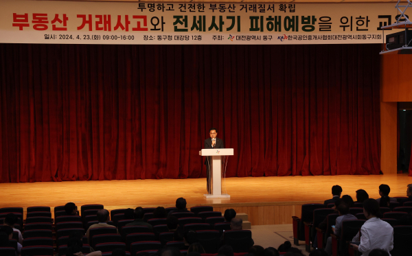 [충청뉴스 박영환 기자] 대전 동구(구청장 박희조)는 23일 동구청 12층 대강당에서 관내 개업·소속 공인중개사 및 중개보조원 등 450여 명을 대상으로 ‘전세사기 피해예방 교육’을 실시했다고 전했다.