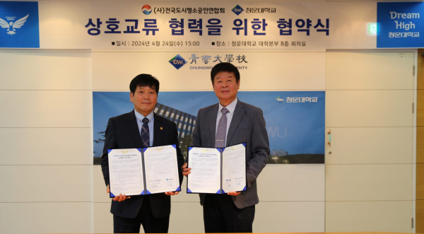 [충청뉴스 권상재 기자] 청운대학교는 (사)전국도시형소공인연합회와 국가산업 발전에 필요한 인재양성 및 산업체위탁교육 강화를 위한 상호협력 업무협약을 체결했다고 24일 밝혔다.