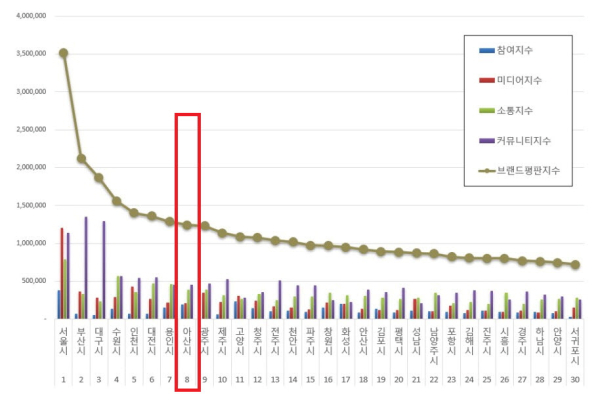 [충청뉴스 박동혁 기자] 충남 아산시의 ‘대한민국 도시브랜드 평판’ 순위가 4개월 연속 10위권을 유지하고 있는 것으로 나타났다.