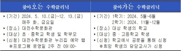 수학클리닉은 수학에 대한 불안과 어려움으로 수학을 포기하거나 지속적인 학습결손이 있는 학생을 대상으로 수학학습 진단을 위한 사전 검사를 실시하고, 상담과 코칭을 통해 수학 학습전략을 습득하여 수학에 대한 자신감을 회복할 수 있도록 지원하는 프로그램이다. 이를 위해 대전 관내 초․중등 수석교사와 수학클리닉 직무연수를 이수한 전문 강사 총 11명으로 구성된 수학클리닉 전문상담 지원단이 활동하고 있다.