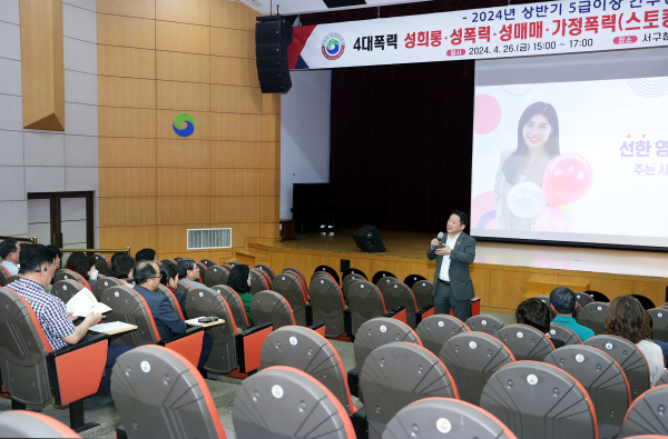 [충청뉴스 박영환 기자] 대전 서구(구청장 서철모)는 지난 26일 청사 구봉산홀에서 ‘2024년 상반기 5급 이상 간부공무원 4대 폭력 예방 통합교육’을 실시했다고 밝혔다.