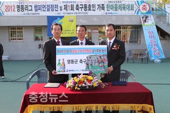 이번 하이트진로(주)와의 후원협약은 ‘2012 영동리그 챔피언결정전 및 축구동호인가족 한마음대회’에 참석한 김선영 영동군축구연합회장을 비롯하여 영동군내 14개축구클럽 가족들이 참석한 가운데 이루어졌다.