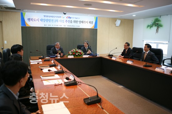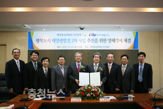 행정중심복합도시건설청(청장 이재홍)은 23일 오전 행복청 브리핑룸에서 한국서부발전㈜(사장 김문덕)과 저탄소 녹색도시 구현을 위한 행복도시 태양광발전 2차 사업 추진 양해각서를 체결했다고 밝혔다.