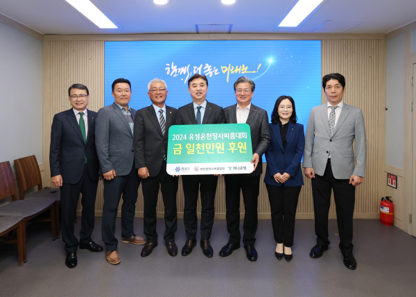 [충청뉴스 박영환 기자] 대전 유성구(구청장 정용래)가 7일 하나은행 충청영업그룹(대표 이동열)에서‘2024 유성온천장사씨름대회’의 성공적인 개최를 위한 후원금 1,000만원을 대전광역시 씨름협회에 기탁했다고 전했다.