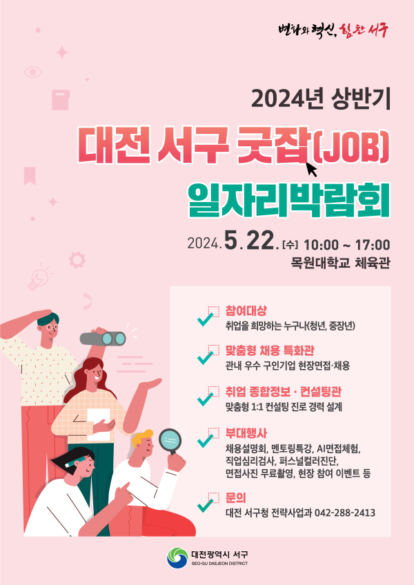 [충청뉴스 박영환 기자] 대전 서구(구청장 서철모)는 취업을 희망하는 구직자를 대상으로 현장 채용을 실시하고 취업 정보를 제공하는 ‘대전 서구 굿잡 일자리박람회’를 오는 22일 목원대학교 체육관에서 개최한다.