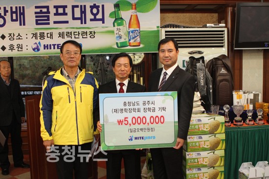 하이트진로(주) 대전지점(지점장 오양균)은 지난 25일 계룡대체력단련장에서 개최된 제5회 (재)명학장학회 이사장배 골프대회에서 명학장학기금 5백만원을 전달했다.