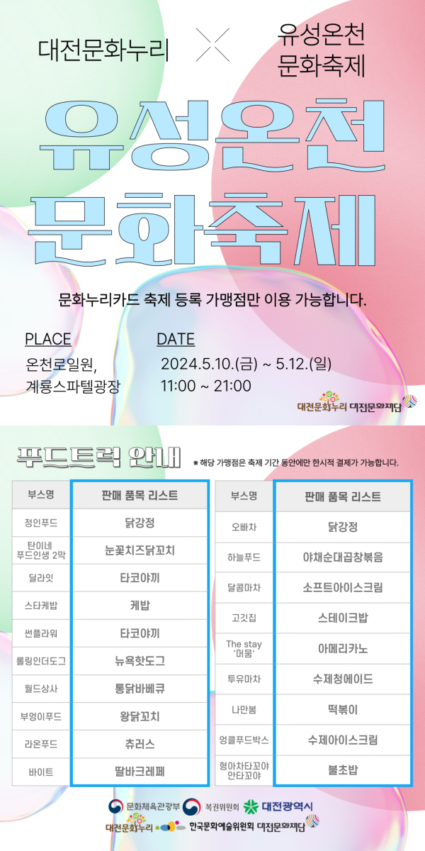 [충청뉴스 박영환 기자] 재단법인 대전문화재단(대표이사 백춘희)은 5월 10일부터 12일까지 열리는 ‘2024 유성온천 문화축제’에서 운영되는 푸드트럭을 한시적으로 문화누리카드 가맹점으로 등록한다. 이용객들은 축제 기간동안 유성온천공원 내 가맹점 스티커가 부착된 푸드트럭 19곳에서 문화누리카드로 결제할 수 있다.