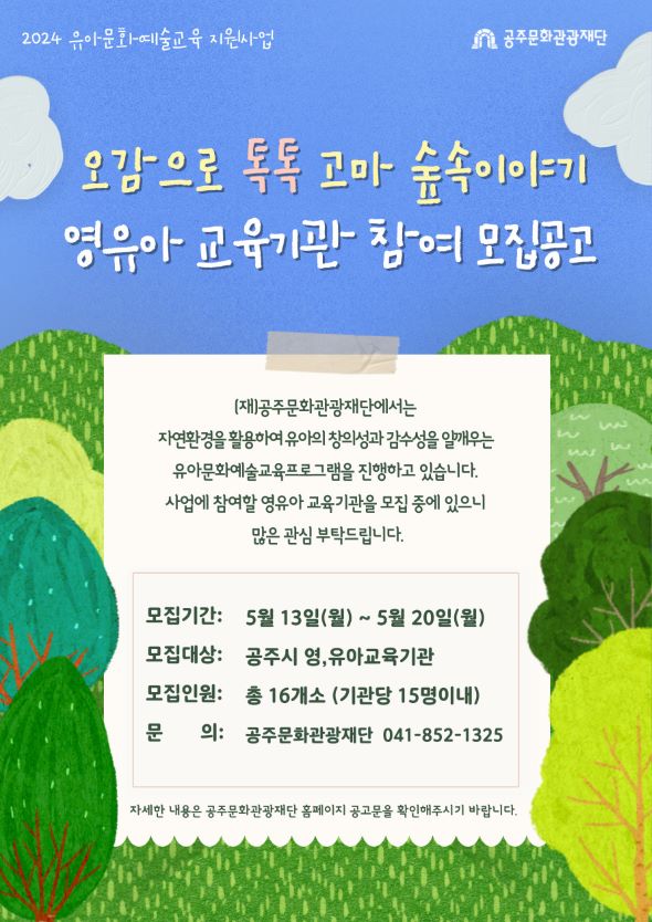 [충청뉴스 공주 = 조홍기 기자] (재)공주문화관광재단(대표이사 김지광)은 오는 5월 13일부터 5월 20일까지 공주시 영유아기관을 대상으로 유아문화예술교육 지원사업 <오감으로 톡톡 고마 숲속이야기> 참여기관을 모집한다.