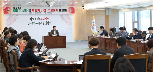 박희조 동구청장 주재로 열린 이번 보고회는 부구청장과 실·국·소·부서장이 참석한 가운데, 민선 8기 지난 2년간의 성과를 공유하고 후반기 구정 운영에 대한 전략과 발전 방향을 모색하는 자리로 마련됐다.