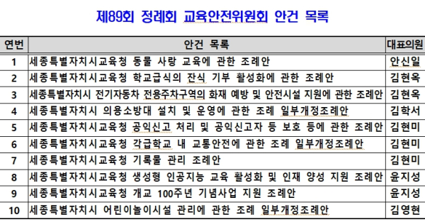 특히, 교육안전위원회 소관 조례안 가운데 의원발의 10건 중 주요 내용은 세종특별자치시 내 학교급식에서 발생하는 잔식을 '식품등 기부 활성화에 관한 법률'에 따라 기부할 수 있도록 하여 환경보호 및 지역 내 나눔문화 확산에 이바지하고자 마련하였다.