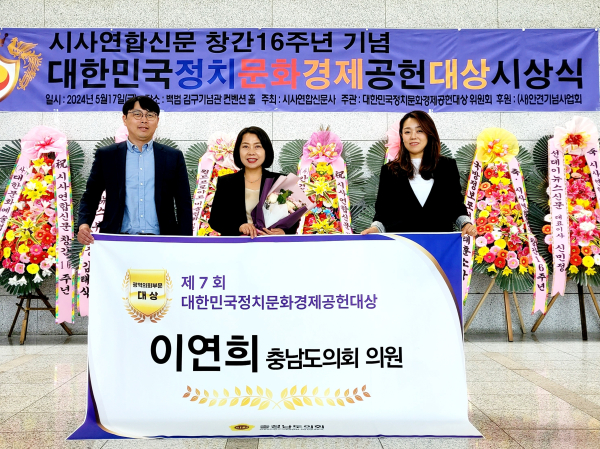 [충청뉴스 권상재 기자] 충남도의회 이연희 의원(서산3·국민의힘)이 제7회 대한민국정치문화경제공헌대상 시상식에서 광역의회부문 대상을 수상했다.