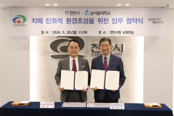 [충청뉴스 박동혁 기자] 충남 천안시는 지난 20일 남서울대학교와 시청 회의실에서 ‘치매 친화적 환경조성을 위한 업무협약’을 체결했다.
