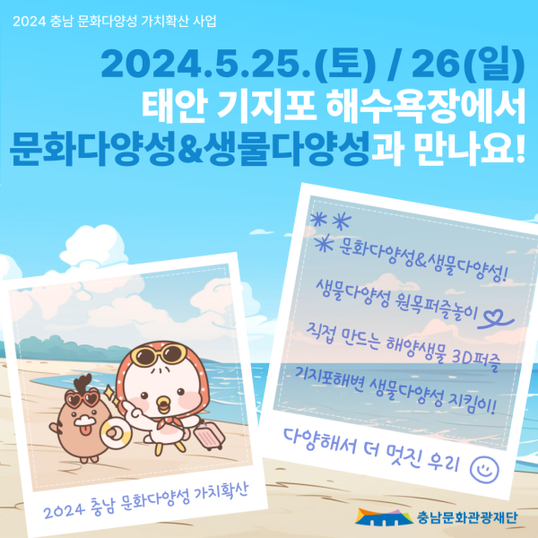 [충청뉴스 권상재 기자] 충남문화관광재단은 오는 25~26일간 태안군 기지포해수욕장에서 2024 문화다양성 가치확산 사업의 일환으로 ‘다양해서 더 멋진 우리 체험 프로그램’을 운영한다.