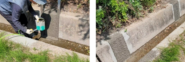 연직의 매끄러운 벽면은‘생태 사다리’ 없이는 넘어가기 어려운 구조이기 때문이다. 이에 모르타르 산포(Mortar Scattering)공법을 적용한 내구성 있는‘생태 사다리’를 콘크리트 배수로 벽면에 설치함으로써 소형야생 동물의 이동을 도울 수 있다.