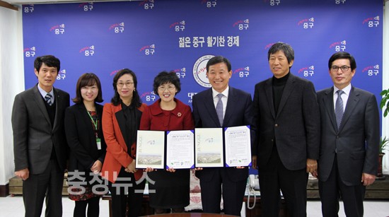 대전광역시 중구(구청장 박용갑)와 초록우산 어린이재단 대전지역본부(본부장 최명옥)는 5일 오후 3시 중구청에서 박용갑 중구청장, 최명옥 초록우산 어린이재단 대전지역본부장 및 관계직원이 참석한 가운데 중구 관내에 거주하는 복합적인 욕구를 지닌 아동의 위기해결 능력 향상 및 자립을 목적으로 하는 아동복지서비스의 원활한 추진을 위하여 업무 협약을 체결했다.