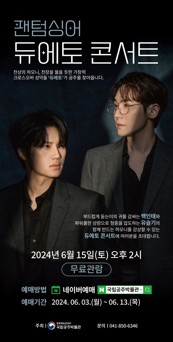 오는 6월 15일(토) 14시 국립공주박물관 강당에서 <듀에토 콘서트>가 개최된다. 이번 공연에 출연하는 '듀에토'는 JTBC 예능프로그램 '팬텀싱어' 시즌 1에서 준우승을 차지한 4인조 중창단 '인기현상'의 멤버 중 백인태와 유슬기로 구성되어 있다.