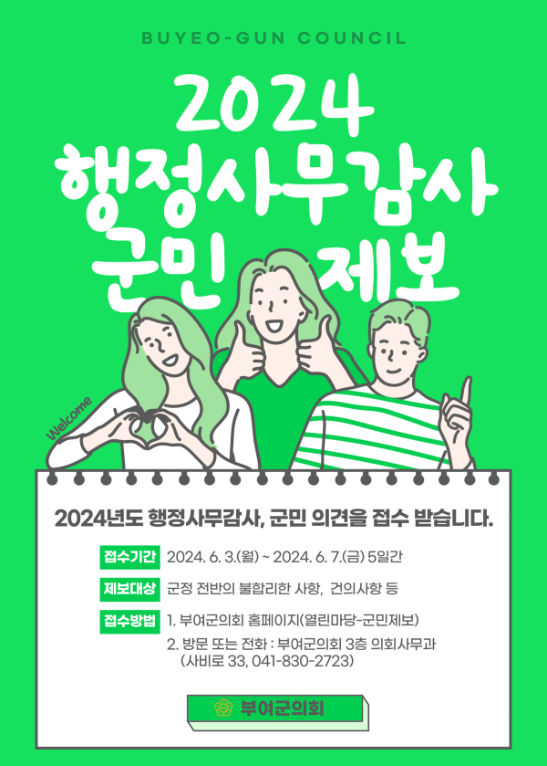 [충청뉴스 부여 = 조홍기 기자] 부여군의회(의장 장성용)는 6월 7일까지 2024년도 행정사무감사와 관련해 군정 전반에 대한 군민제보를 접수받고 있다.