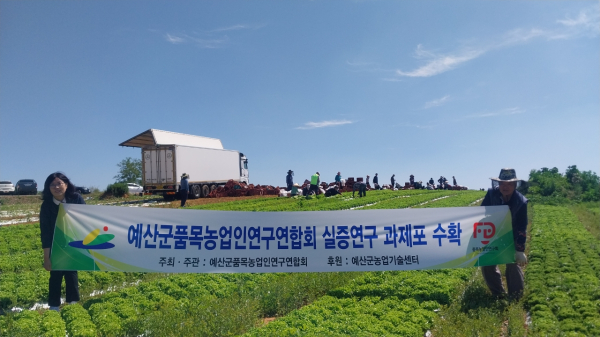 [충청뉴스 권상재 기자] 예산군품목농업인연구연합회(이하 연합회)는 고덕면 상궁리 일원 실증연구 과제포장에서 회원 60여명이 참석한 가운데 로메인 상추 수확 작업을 실시했다고 10일 밝혔다.
