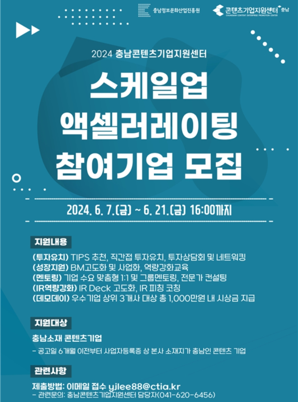 [충청뉴스 박동혁 기자] 충남정보문화산업진흥원(이하 진흥원) 충남콘텐츠기업지원센터는 ‘2024 스케일업 액셀러레이팅 프로그램’에 참여할 충남 도내 콘텐츠 기업을 모집한다고 11일 밝혔다.