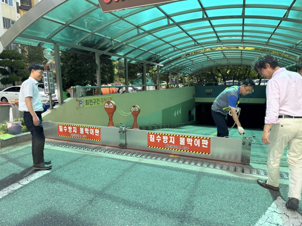 서구는 공동주택 지하주차장 침수방지시설(차수판) 설치 단지 7개소, 대형 옹벽 설치 단지 4개소를 점검했다. 주요 점검 내용은 ▲지하주차장 입구에 설치한 차수판 유지관리 실태와 차수판 사용 방법, 침수 시 비상대응체계 등 ▲축대, 옹벽 구조물 균열 및 배수 상태 등이다.