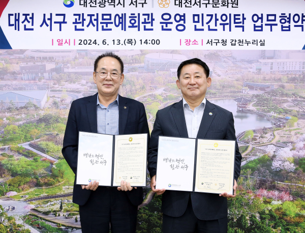 [충청뉴스 박영환 기자] 대전 서구(구청장 서철모)는 13일 구청 갑천누리실에서 대전서구문화원(원장 장석근)과 ‘관저문예회관 운영 민간위탁 업무협약’을 체결했다고 전했다.