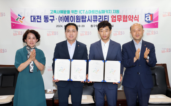 [충청뉴스 박영환 기자] 대전 동구(구청장 박희조)는 지난 13일 구청장 접견실에서 ㈜에이원탑시큐리티(대표이사 조현호)와 고독사 예방을 위해 정보통신기술 활용 안심 지원(ICT스마트안심패키지) 관련 업무협약을 체결했다.