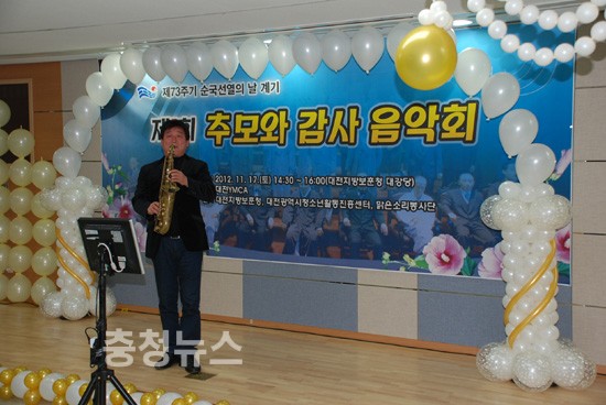 나라를 위해 희생한 순국선열의 날 제73주기를 맞아 선열들의 숭고한 나라사랑 정신을 함양하고 그 뜻을 널리 계승하기 위한 제1회 청소년 대상 추모와 감사음악회가 17일 오후 대전YMCA(총장 박장동)이 주관하고 대전지방보훈청(청장 신영교), 대전광역시청소년활동진흥센터(소장 김명수), 맑은소리봉사단(단장 노영달)이 후원하는 가운데 대전지방보훈청 대강당에서 개최됐다.