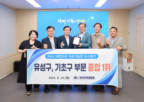 [충청뉴스 박영환 기자] 대전 유성구는 지난 24일 지역의 경쟁력 강화를 위해 (사)한국지역경영원이 실시한 2024 대한민국 지속가능한 도시평가에서 총점 564.4점으로 기초구 부문 종합 1위에 선정돼 상패를 수여받았다.