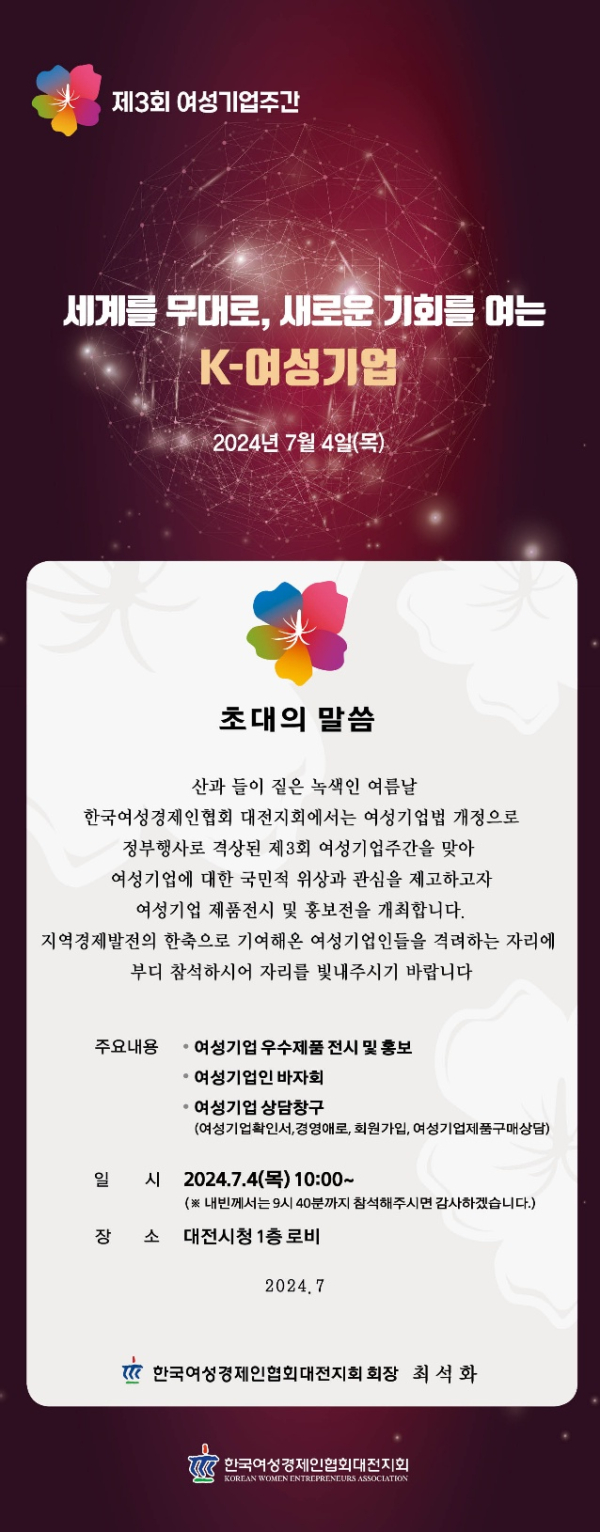 [충청뉴스 박영환 기자] 한국여성경제인협회 대전지회(회장 최석화)는 제3회 여성기업주간을 맞아 여성기업의 위상제고와 자긍심 고취를 위해 다음달 4일 대전시청 1층에서 여성기업 주간행사를 개최한다고 전했다.