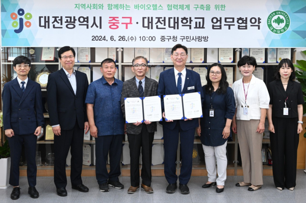 [충청뉴스 박영환 기자] 대전 중구(구청장 김제선)는 26일 대전대학교 바이오헬스 혁신융합대학 사업단(단장 안요찬)과 바이오헬스 지산학 협력 체계 구축을 위한 업무협약(MOU)을 체결했다고 밝혔다.