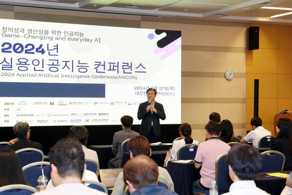 27일 대전컨벤션센터(DCC)에서 열린 2024년 실용인공지능 컨퍼런스에서 유성 데이터 기반 실증 리빙랩 특별세션에 앞서 정용래 유성구청장이 인사말을 하고 있다.