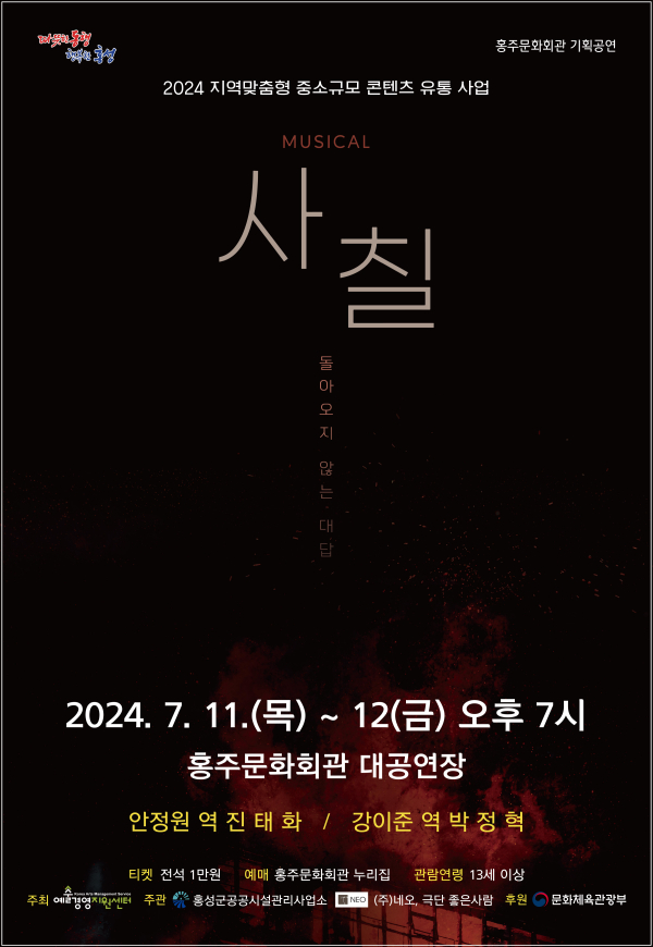 [충청뉴스 권상재 기자] 홍성군 홍주문화회관이 문화체육관광부와 예술경영지원센터가 주최하는 ‘2024년 지역맞춤형 중소규모 콘텐츠 유통사업’에 선정되어 뮤지컬 ‘사칠’을 오는 11~12일간 선보인다.