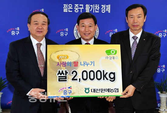 대전원예농협(조합장 김의영)은 26일 중구(구청장 박용갑)에 어려운 이웃 지원을 위한 백미 2,000kg (450만원 상당)을 기탁하여 이웃과 함께하는 나눔문화 확산에 동참했다.