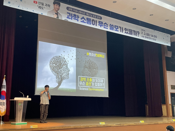 “과학 소통이 무슨 쓸모가 있을까?”라는 주제로 진행된 특강은 청소년들에게 뜨거운 관심을 받으며 등장한 유튜브 채널 ‘안될과학’을 운영하는 과학 유튜버‘궤도(김재혁)’가 강연했다.