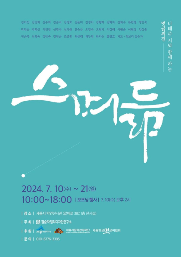 [충청뉴스 최형순 기자] 김순자캘리디자인연구소장을 비롯한 회원 33명은 오는 10일부터 21일까지 세종시 박연 전시관에서 세종특별자치시, 세종시문화관광재단, 세종한글멋글씨협회 후원으로 나태주의 시 멋글씨전 ‘스며듦’ 전시회가 열린다.