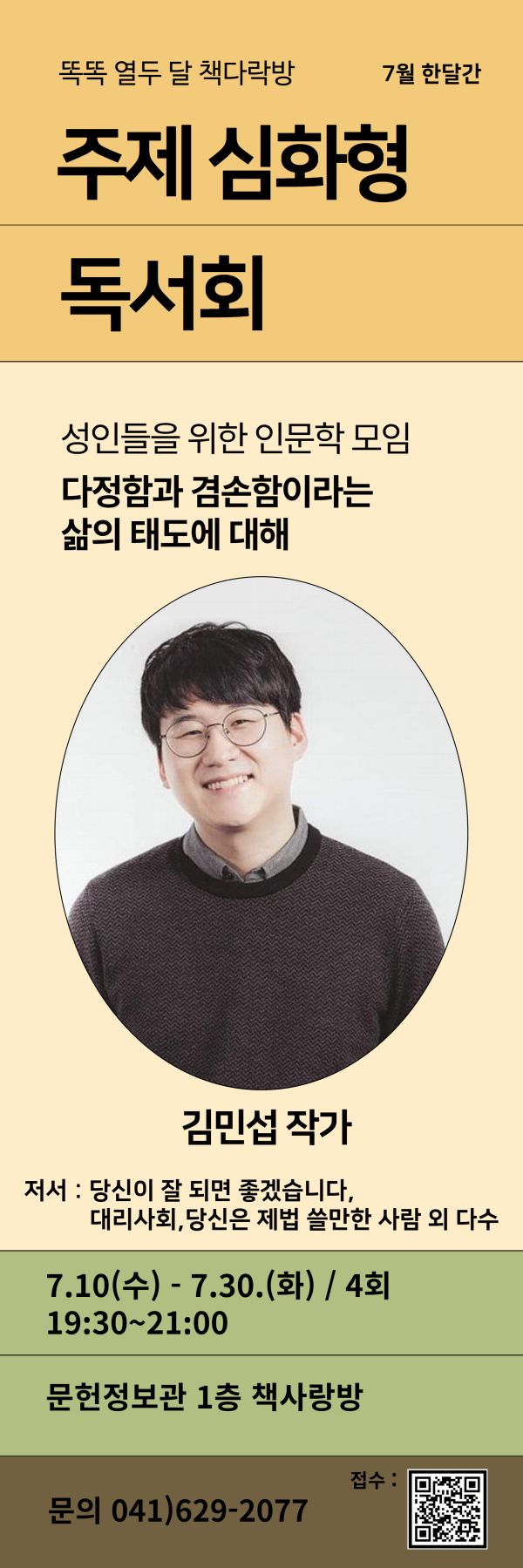 ‘주제 심화형 독서회’는 주제 관련 전문가와 함께하는 대면 모임으로 김민섭 작가를 진행자로 위촉하여 삶과 내면에 관련된 주제를 깊이 탐구하며, 독서에 관심있는 지역주민 누구나 참여할 수 있다.