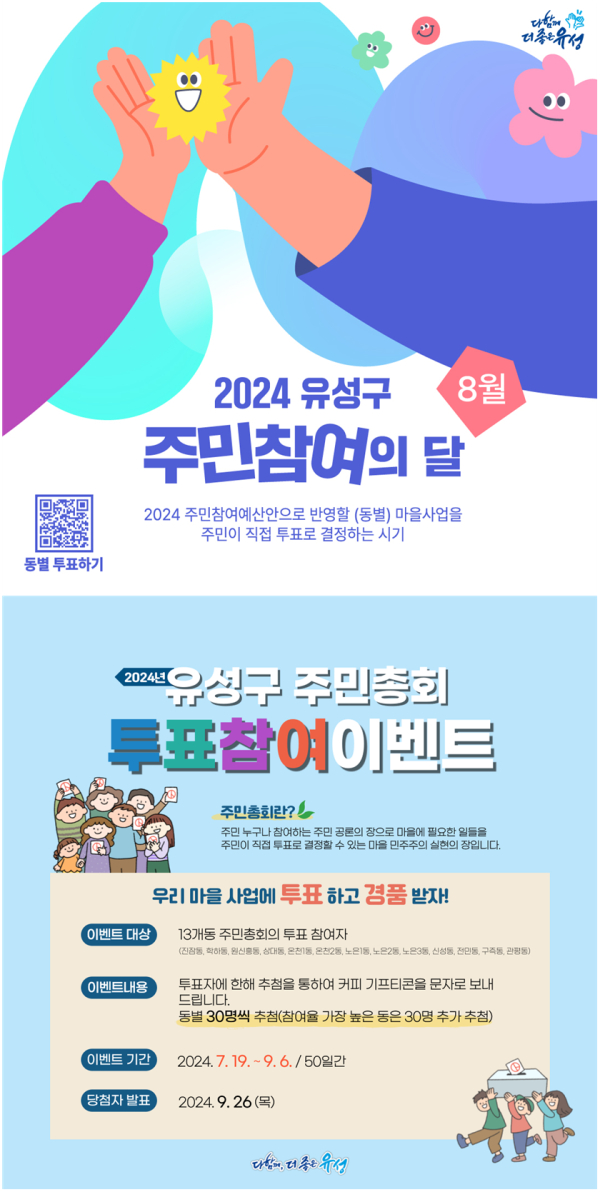 [충청뉴스 박영환 기자] 대전 유성구가 주민참여예산제도를 널리 알리고 참여 확대를 위해 다가오는 8월을 ‘유성구 주민참여의 달’로 지정해 운영한다고 밝혔다.