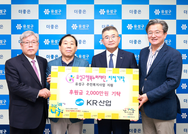 [충청뉴스 박영환 기자] 대전 유성구(구청장 정용래)는 17일 구청 행복사랑방에서 계룡그룹 ㈜케이알산업(대표이사 박희성)이 유성구 행복누리재단에 후원금 2,000만 원을 기탁했다고 전했다.