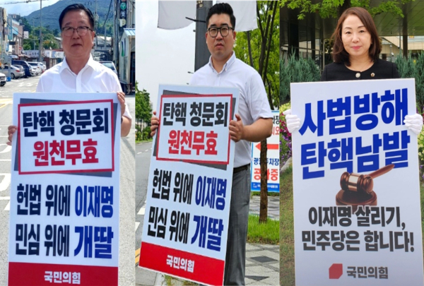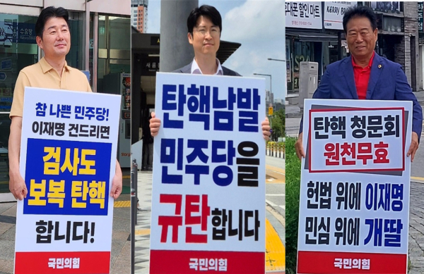 이어서 17일부터는 절차도 무시하고 민주당 독단으로 추진하고 있는 탄핵청문회와 관련해 ‘탄핵청문회 원천무효, 헌법 위에 이재명, 민심 위에 개딸’,‘이재명 위해 불법 탄핵 청문회 합니까’ 등의 내용이 담긴 피켓시위를 수시로 이어가고 있다.