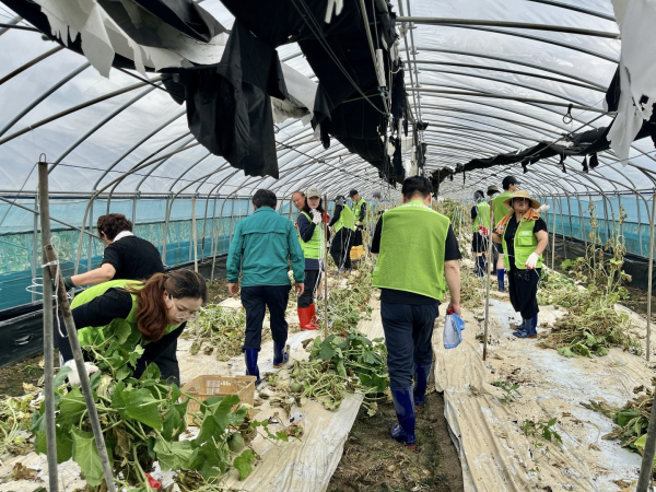 피해 현장에 투입된 직원들은 무더위 속 하우스 안에서 엉망이 된 농사현장을 정리하고 상한 과일과 넝쿨을 치우며 구슬땀을 흘렸다.