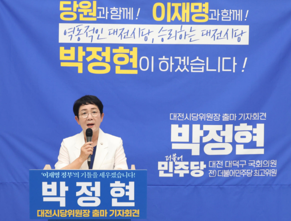 박 의원은 23일 대전시의회 로비에서 출마 기자회견을 열고 "당원과 함께 이재명과 함께 역동적인·승리하는 대전시당을 만들겠다"며 지지를 호소했다.