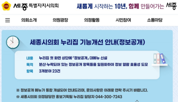 [충청뉴스 최형순 기자] 세종특별자치시의회(의장 임채성)는 24일 "시민과 소통하는 열린 의회상을 구현하기 위해 누리집의 정보공개 항목 통합 정비를 완료했다"고 밝혔다.