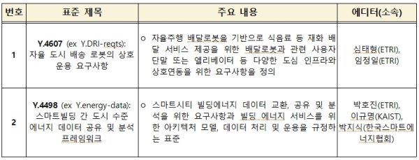ETRI 연구진 주도로 개발한 ▲배달 로봇 연동 요구사항 ▲사물인터넷 기기 권한 위임 프레임워크 총 2건의 표준은 사전 채택됐으며 ▲메타버스 기반 디지털트윈 상호연동 ▲스마트 농업에서의 작물 생장 모니터링 등 11건이 신규 표준화 과제로 채택됐다.